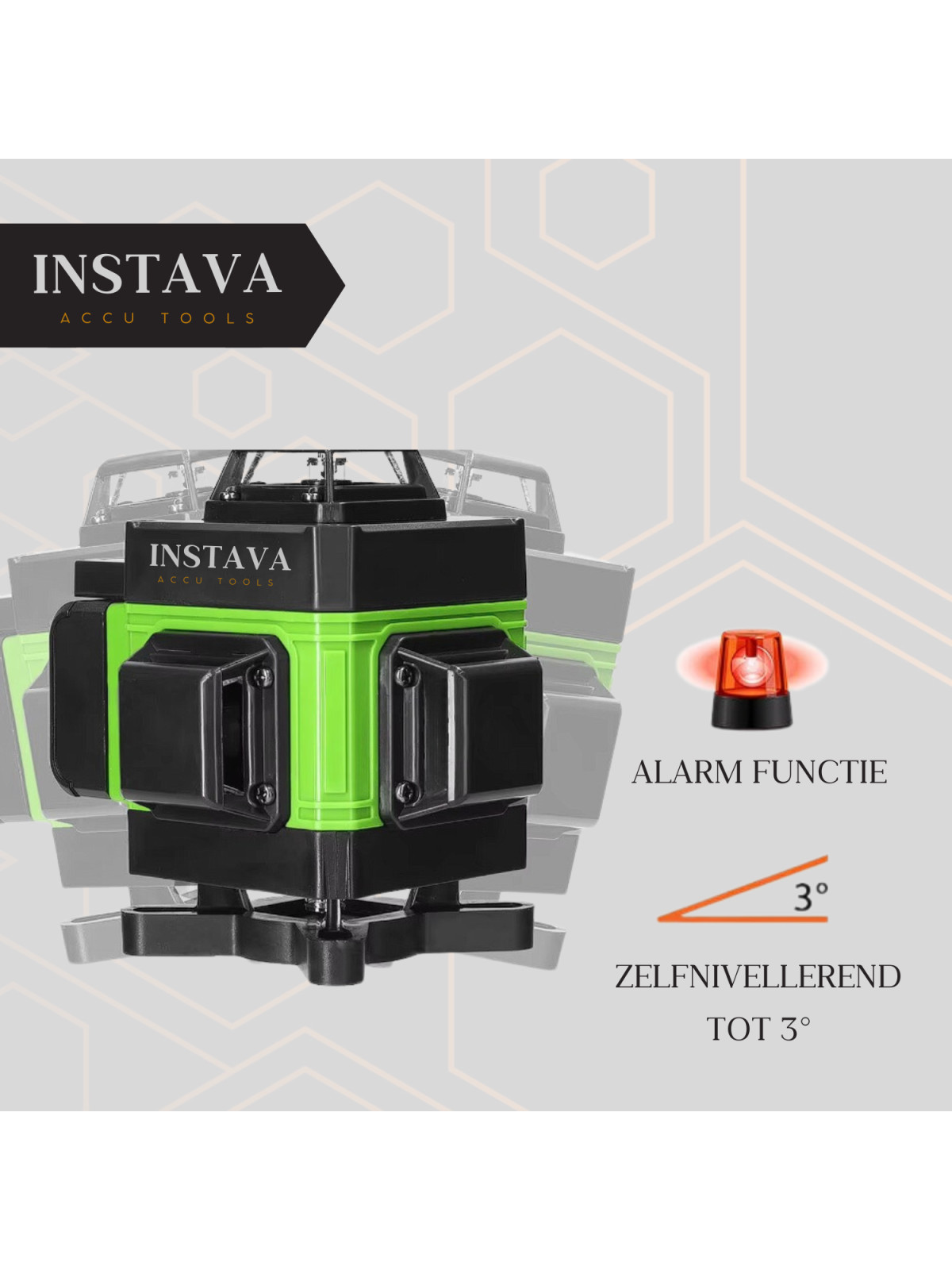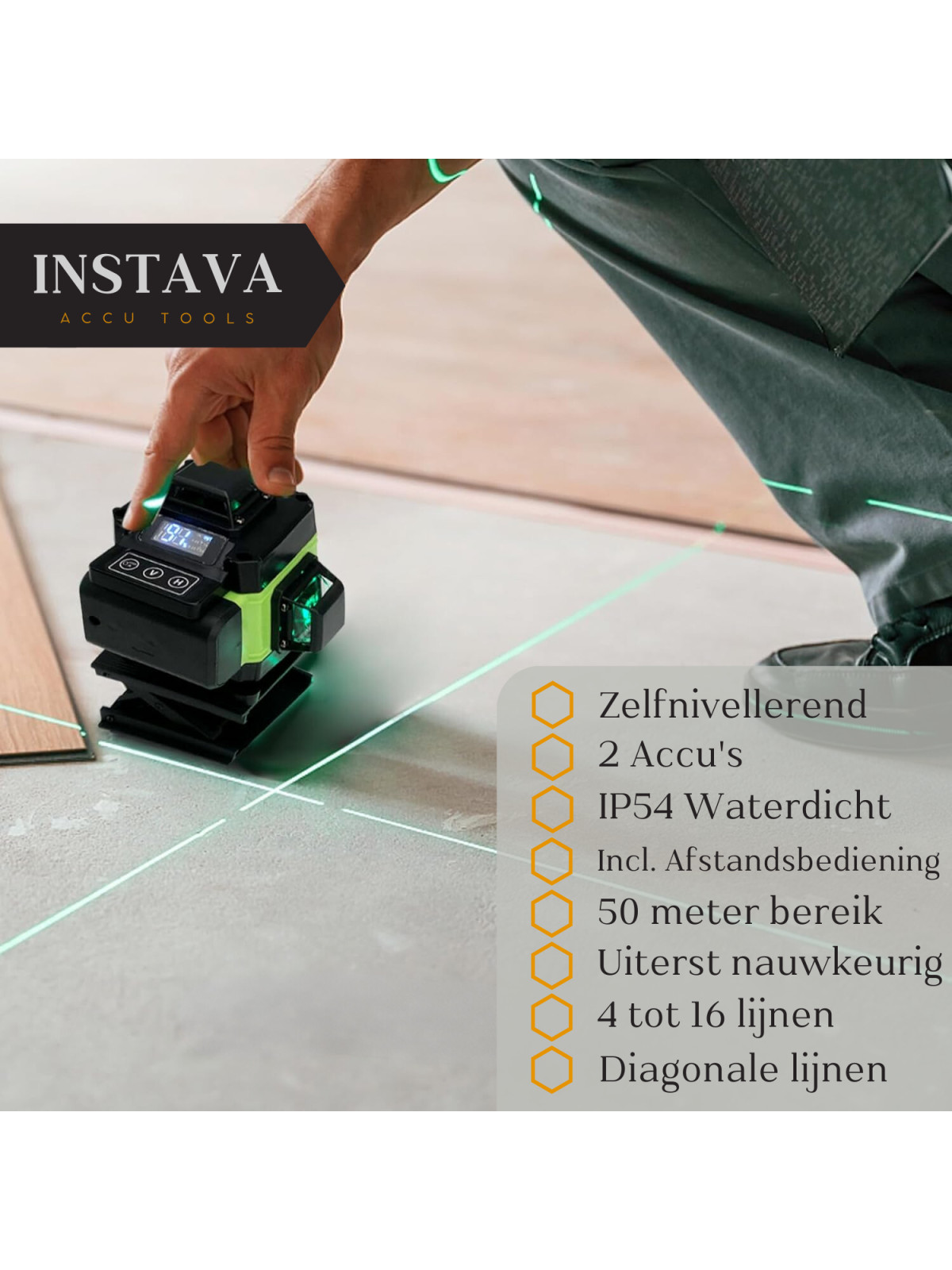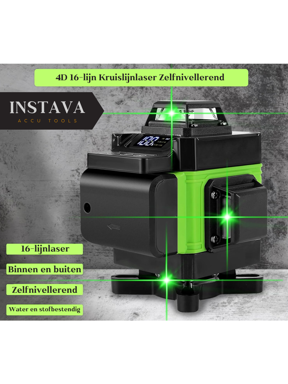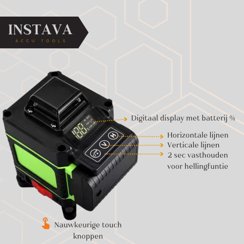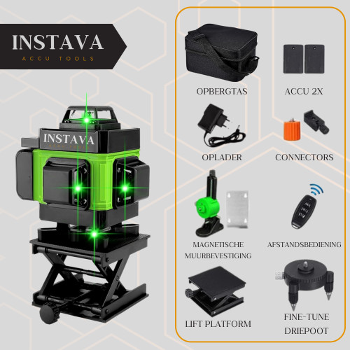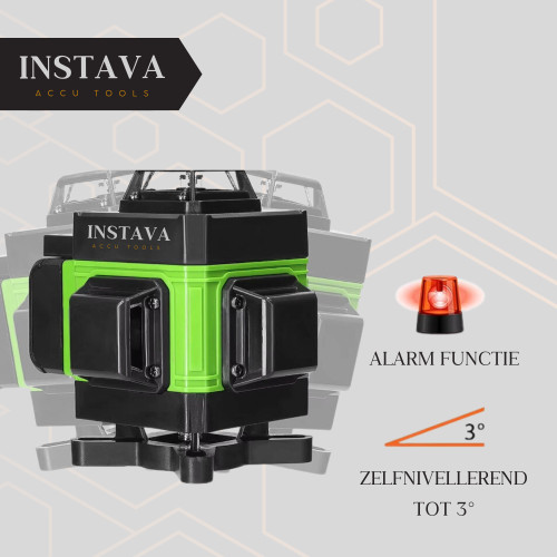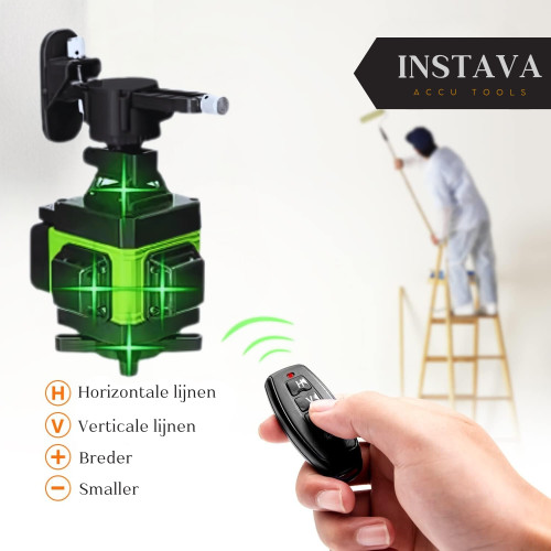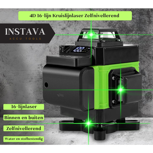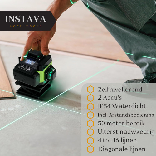 Met 16 laserlijnen afzonderlijk of gelijktijdig voor een fijnere positionering, met 3° zelfnivellerend systeem, flexibiliteit en stabiliteit.