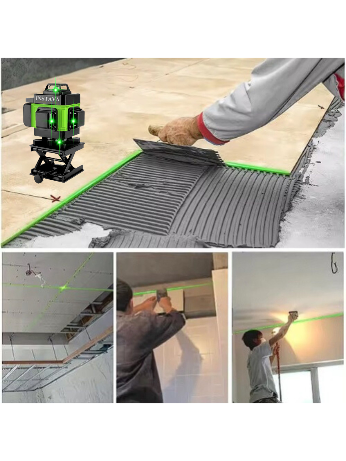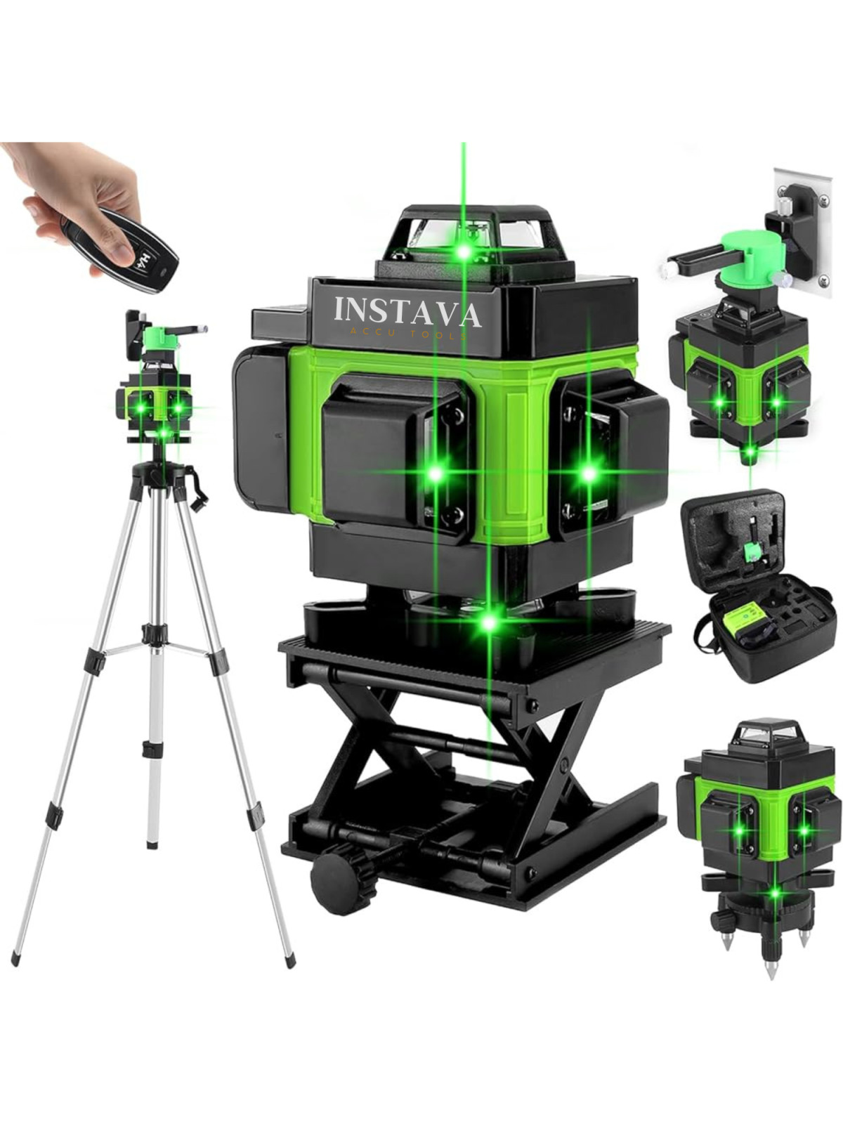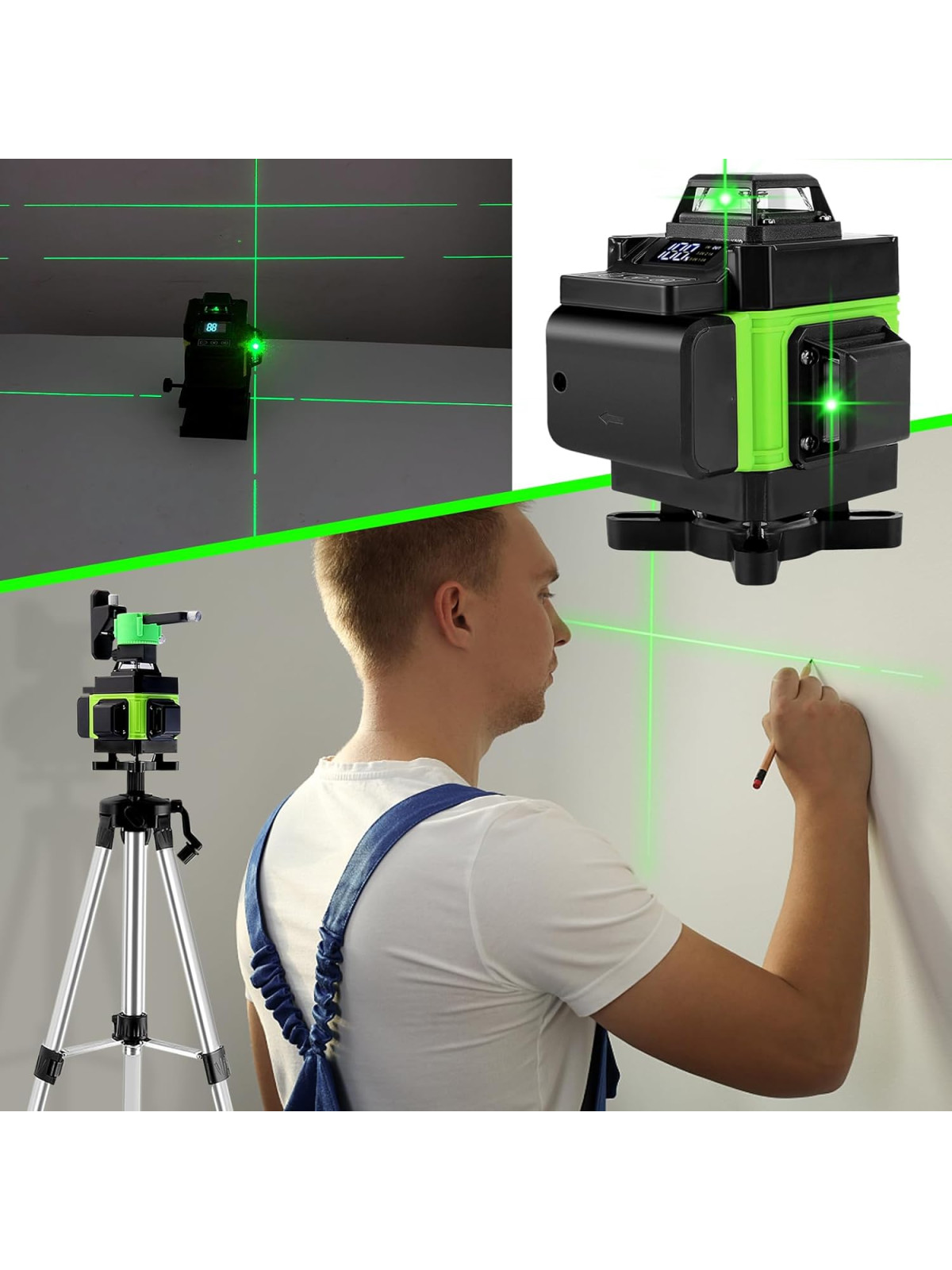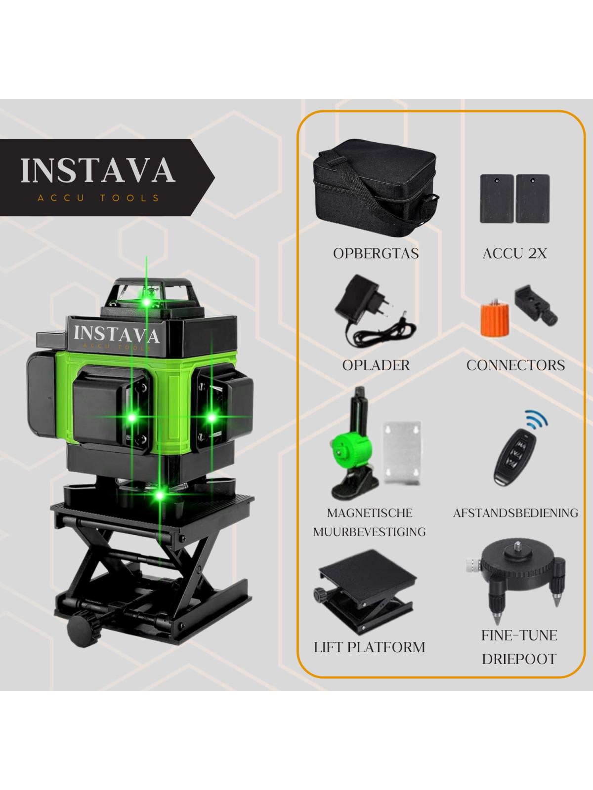 Met 16 laserlijnen afzonderlijk of gelijktijdig voor een fijnere positionering, met 3° zelfnivellerend systeem, flexibiliteit en stabiliteit.