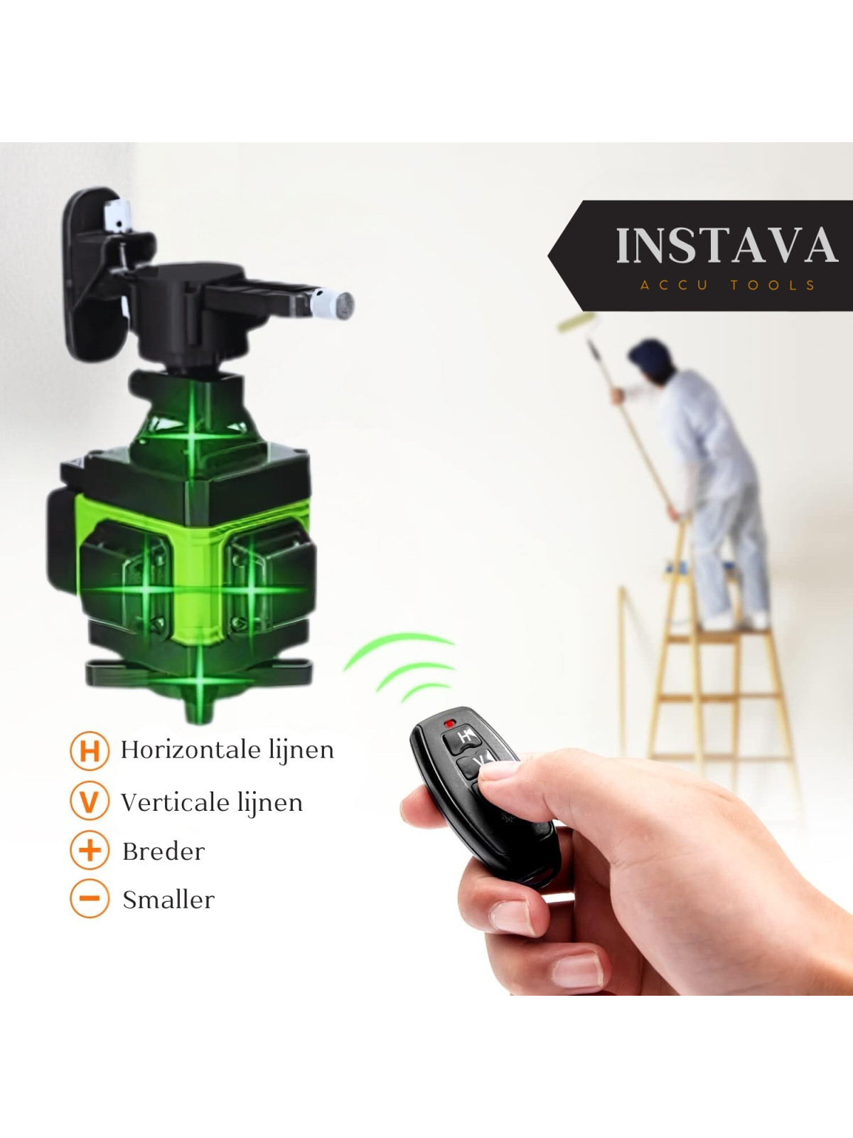 Wordt geleverd met afstandsbediening, "V"=verticale lijn, "H"=horizontale lijn, en u kunt de helderheid van het laserlicht eenvoudig aanpassen door op de knop "+" of "-" te drukken.
