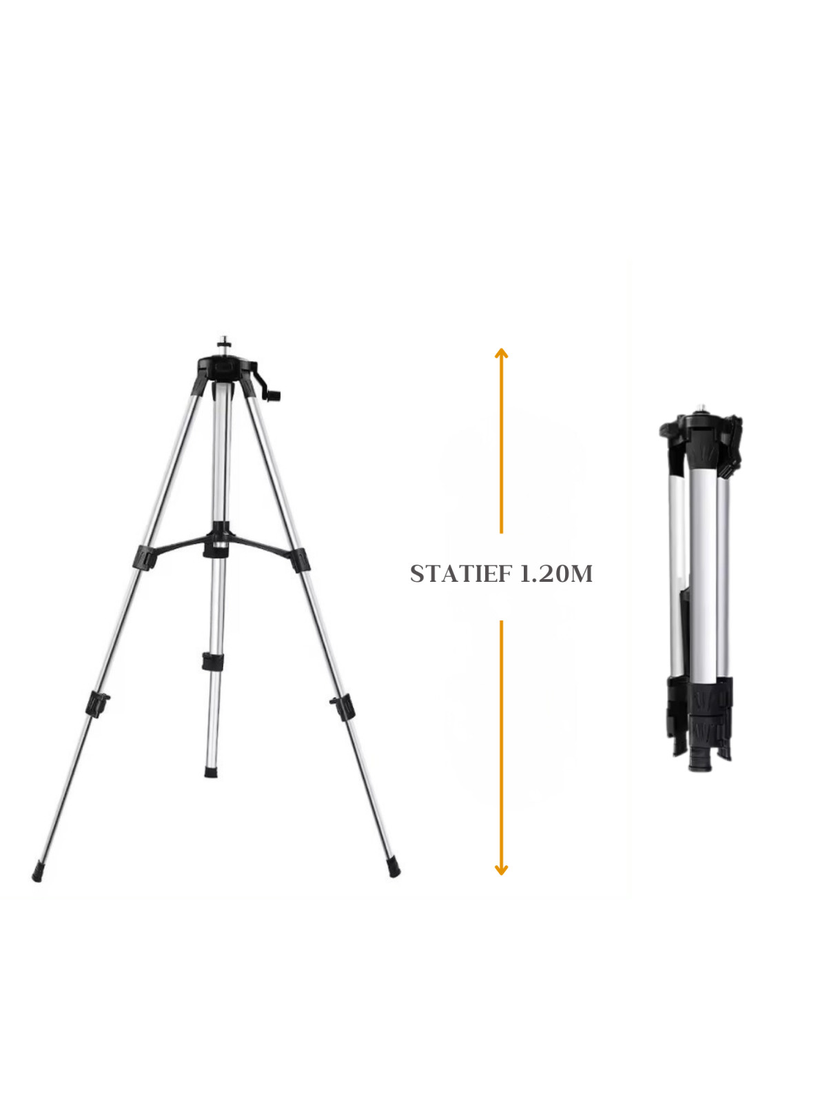 Het Instava statief heeft een maximale hoogte van 120 cm en is in hoogte verstelbaar, zodat je de laser op de gewenste hoogte kunt instellen voor jouw klus.
